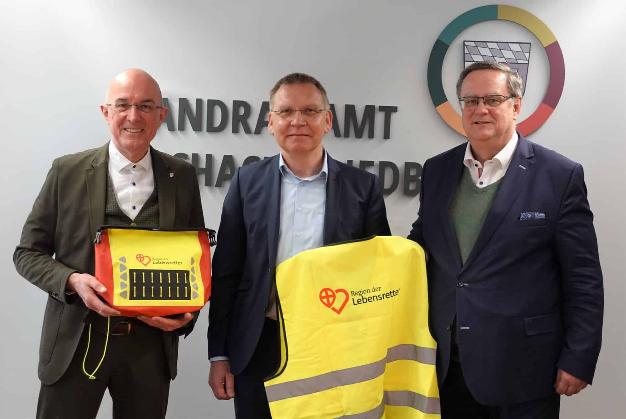 Hinter“ Prof. Dr. Axel Heller (Mitte) vom Universitätsklinikum Augsburg und der Initiative „Region der Lebensretter“ stehen Landrat Dr. Klaus Metzger (links) und Dr. Hubert Mayer, Geschäftsführer der Kliniken an der Paar – in jeder Hinsicht (Bild © Landratsamt Aichach-Friedberg, Wolfgang Müller).