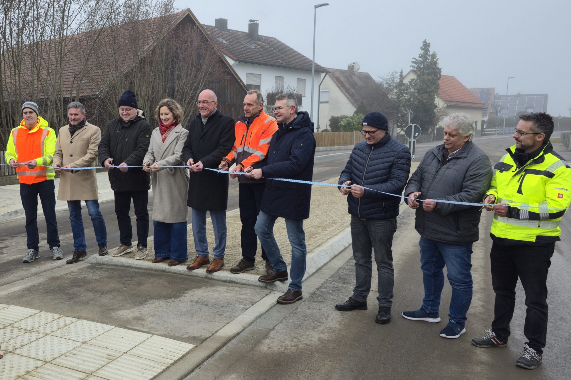 Bild (© Landratsamt Aichach-Friedberg, Thomas Worsch): Nach erfolgreicher Sanierung wieder frei für den Verkehr: Die Ortsdurchfahrt Unterbergen im Zuge der Kreisstraßen AIC 12 und AIC 17. Auf dem Foto von links nach rechts: Franz Balleis (Projektleiter Tiefbau/Bauhof Landratsamt Aichach-Friedberg), Martin Völkel (Abteilungsleiter Kommunales Bauwesen Landratsamt Aichach-Friedberg), Georg Resch (Kreisrat; Bauausschuss), Marina Jakob (MdL), Landrat Dr. Klaus Metzger, Josef Wecker (Erster Bürgermeister Gemeinde Schmiechen), Peter Tomaschko (MdL), Christian Mutter (Zweiter Bürgermeister Gemeinde Schmiechen), Erwin Hämmerle (Oberbauleiter Leonhard Weiß GmbH & Co. KG) und Stefan Kappeller (Abteilungsleiter Team Tiefbau Augsburg Kling Consult GmbH).