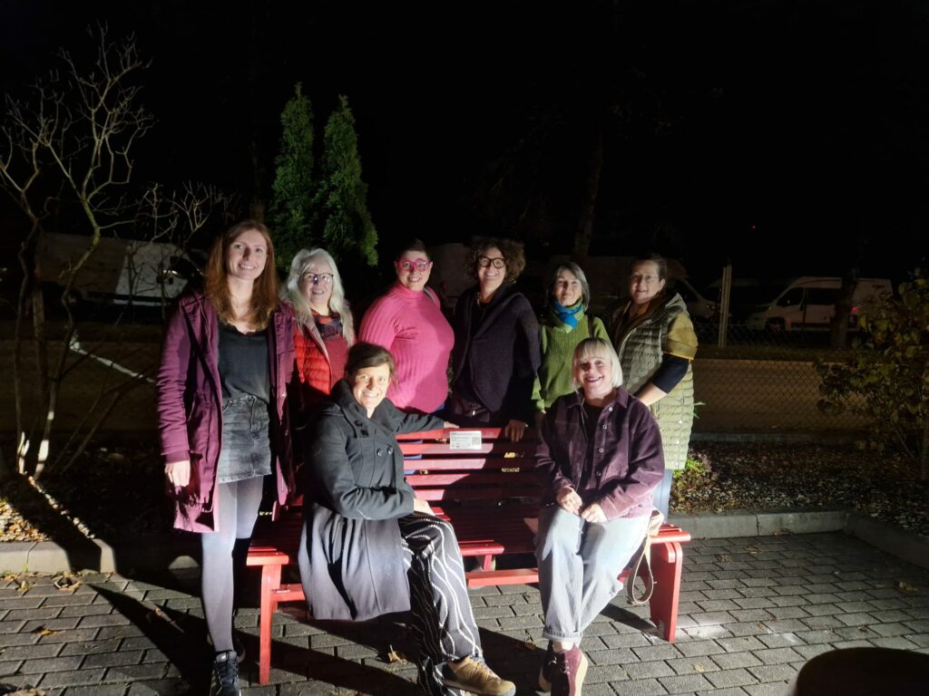 Auf der „Panchina rossa“ am Landratsamt – Symbol und „Anlaufstelle“ gegen Gewalt an Frauen – sitzen (von links) Gleichstellungsbeauftragte des Landkreises Nicole Matthes, Schreiner Ralf Dippel, Rosa Straub (Caritas-Tagesstätte für psychische Gesundheit Aichach) und Caritas-Geschäftsführer Robert Winzer; dahinter stehen (von links) Julia Baur (Familienstützpunkt und stellv. Caritas-Geschäftsführerin), Landrat Dr. Klaus Metzger, Schreiner Peter Bammer und stellvertretende Gleichstellungsbeauftragte Jutta Schnitzlein (© Landratsamt Aichach-Friedberg, Wolfgang Müller).