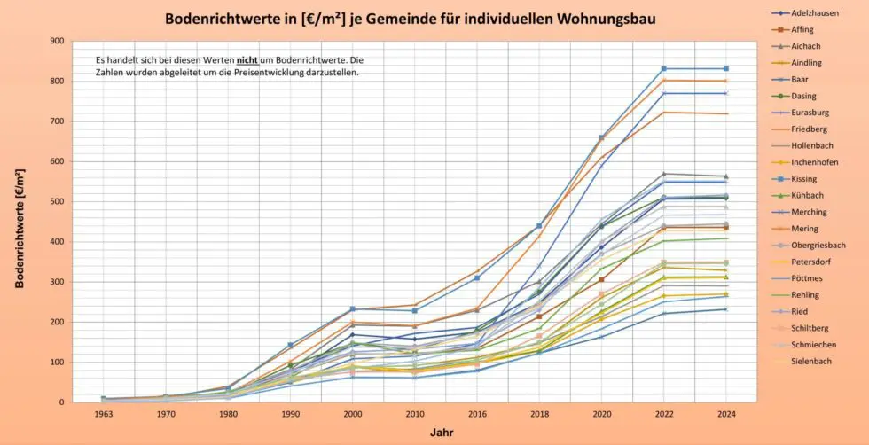 In folgender Grafik wird die aufeinander angepasste Bodenwertentwicklung in jeder Gemeinde von 1960 bis 2024 aufgezeigt. Es ist eine verallgemeinerte Darstellung und eine Zusammenfassung von Mittelwerten ganzer Gemeindegebiete. Die Werte innerhalb einer Gemeinde wurden historisch unterschiedlich abgeleitet, z. B. die Trennung der Nutzungsarten oder die Abgrenzung von Zonen. Zusätzlich gab es Gemeindegebietsveränderungen. Aus der Abbildung kann jedoch in etwa die Preisentwicklung über einen längeren Zeitraum entnommen werden. Pauschale Aussagen zu prozentualen Preissteigerungen sind grundsätzlich nicht zulässig.