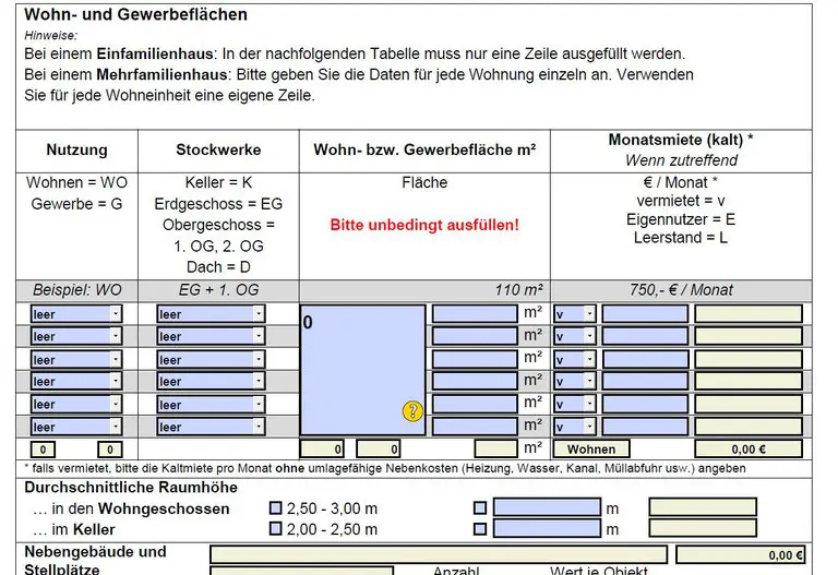 Sofern Ihnen nicht alle Informationen zu einem Grundstück oder Objekt vorliegen, können Sie das an den geeigneten Stellen kenntlich machen. Bitte senden Sie den Fragebogen trotzdem zurück an die Geschäftsstelle.