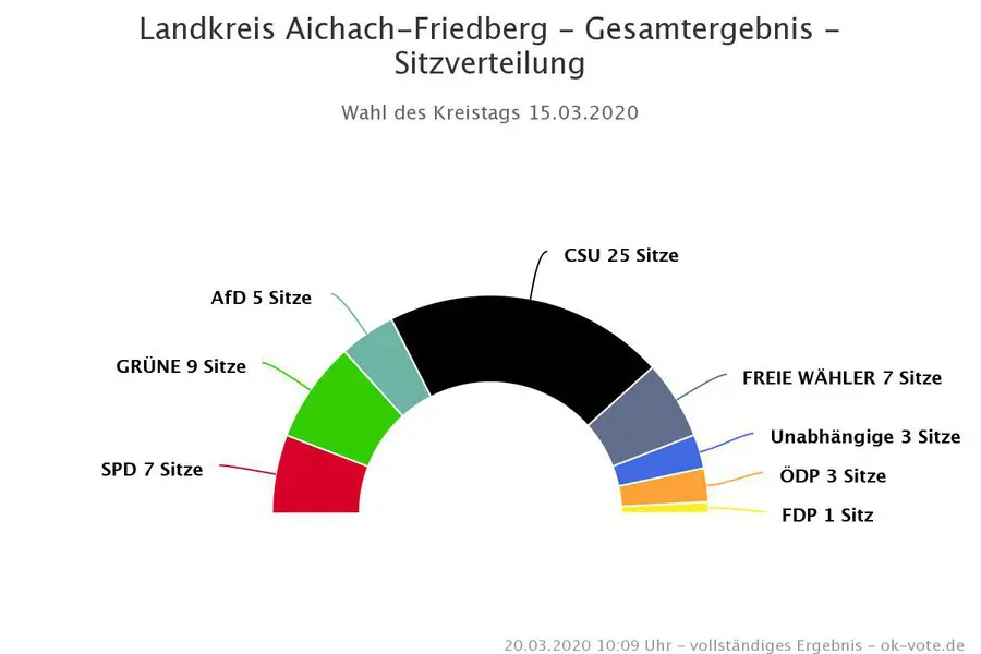 Die Kreistagswahlen vom März 2020 ergeben im Kreistag des Landkreises Aichach-Friedberg folgende Sitzverteilung: